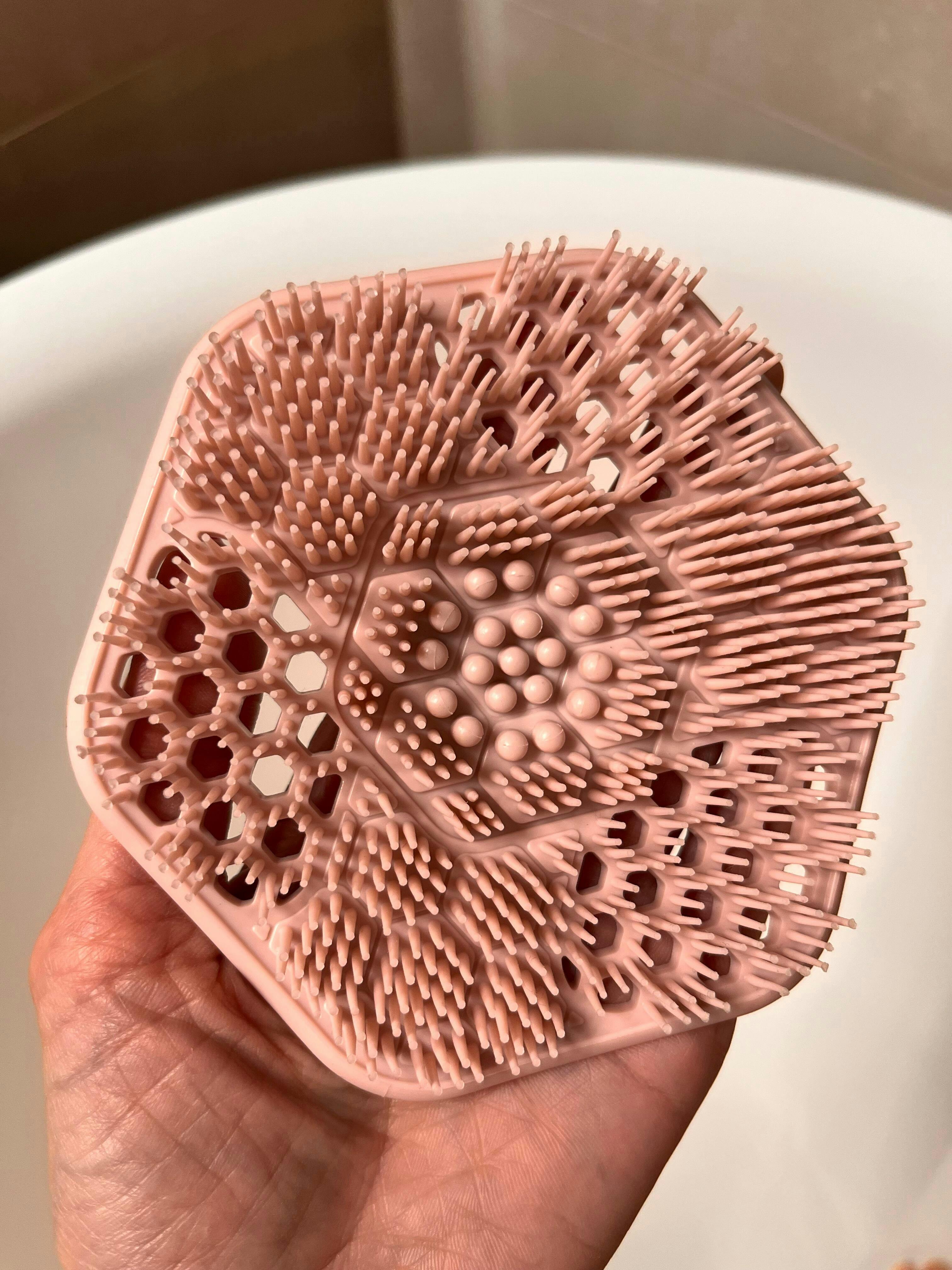 Podobnie jak silikonowy pad do mycia . - rewelacyjnie masuje i bardzo spienia nawet kroplę płynu. który nakładam na dysk. Dobrze trzyma się w dłoni.