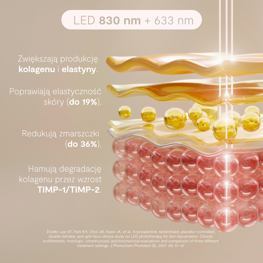 ⭐ Czerwone LED (630 nm) wspiera produkcję kolagenu — gładszy, bardziej elastyczny wygląd skóry